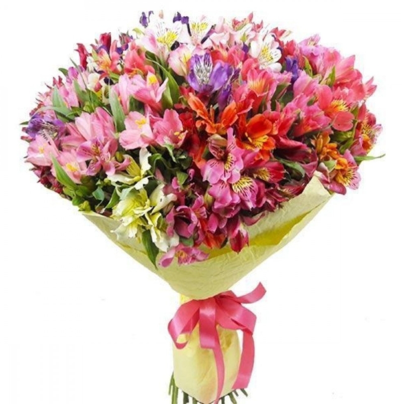 Букет состоит из 35 разноцветных альстромерий, красивая упаковка, атласная лента.