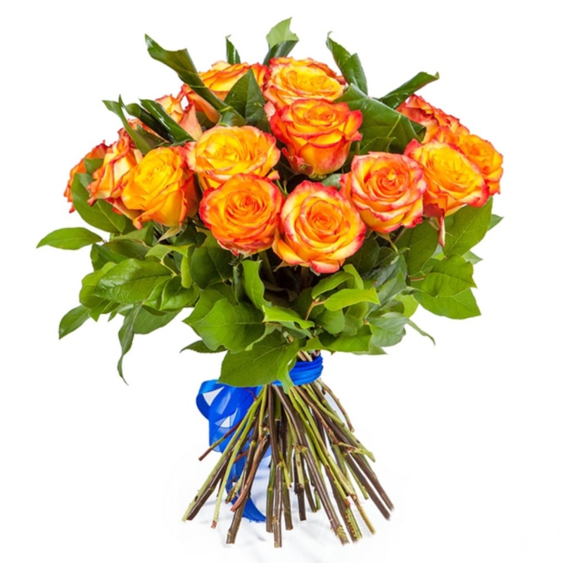 Букет состоит из 21 оранжевая роза, зелень, прозрачная упаковка, атласная лента.
