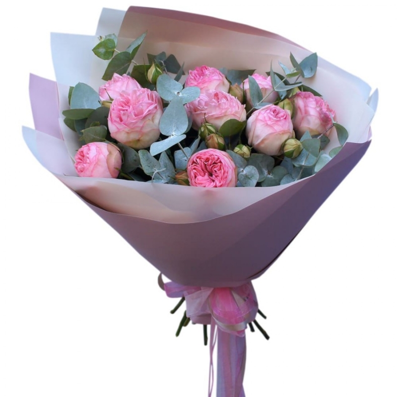 Букет состоит из 9 кустовых пионовидных роз, эвкалипт, красивая упаковка, атласная лента.