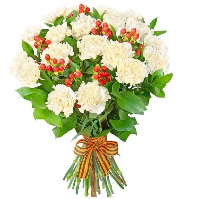 Букет состоит из 19 белых гвоздик, 8 веток гиперикума, прозрачная упаковка, лента.